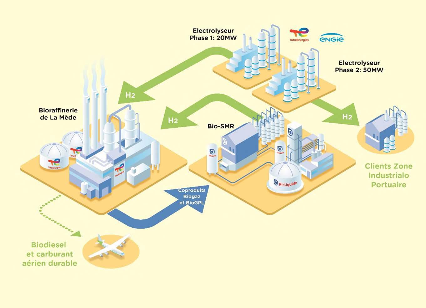 - Un électrolyseur de 20MW (8 t/j d'H2) en JV 50/50 avec ENGIE pour alimenter l’unité HVO, opéré par La Mède. Prêt démarrage 2029.