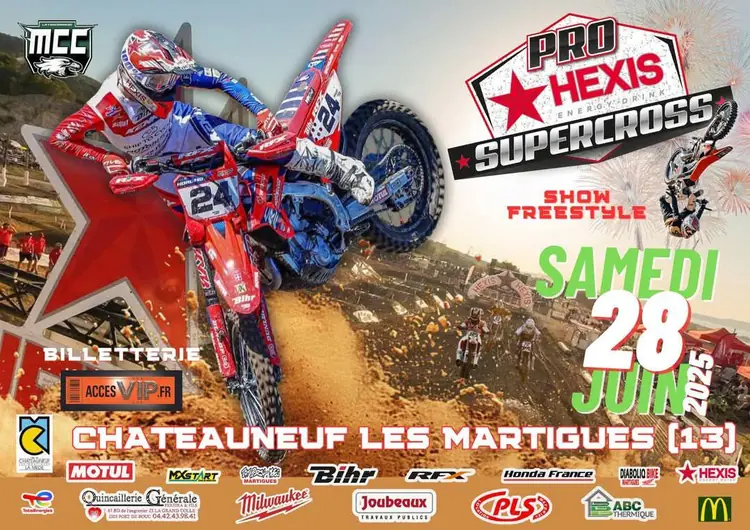 Votre CSE vous propose la billetterie pour le Supercross Pro Héxis à Châteuneuf-les-Martigues, qui se déroulera le samedi 29 juin 2024.